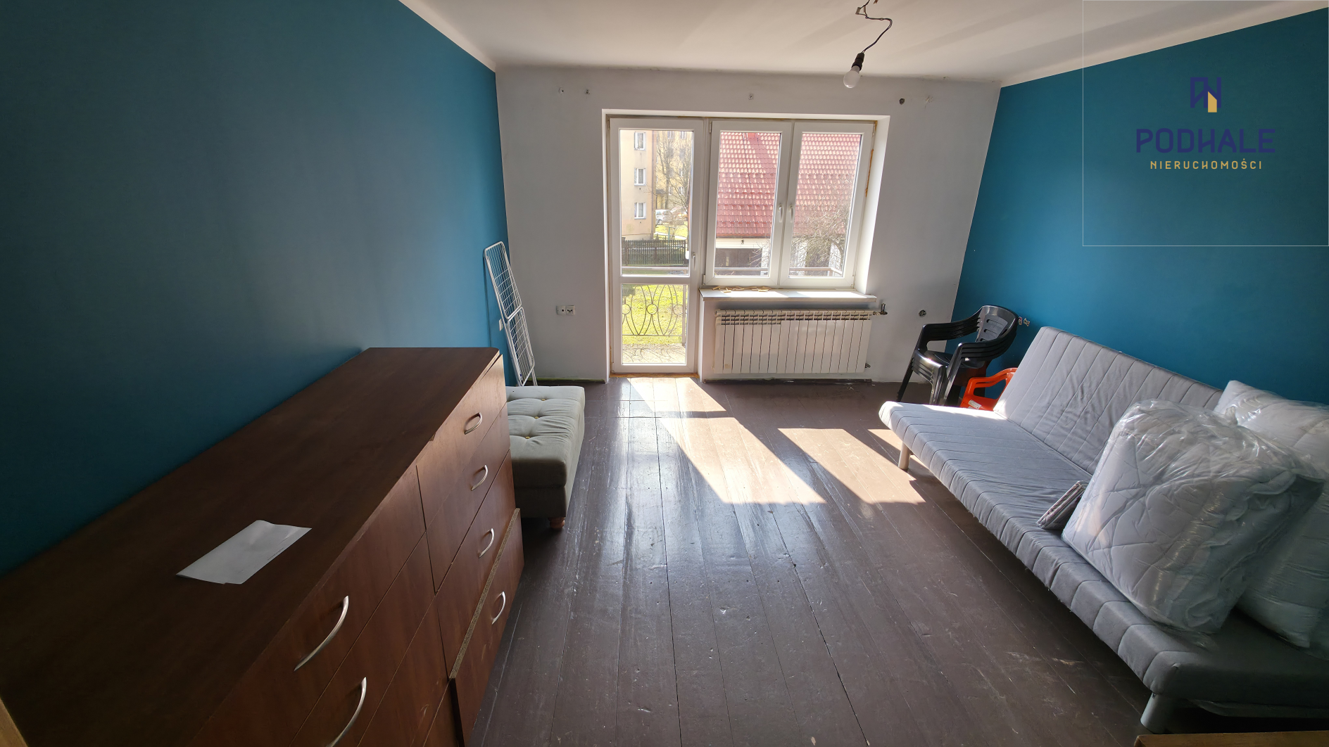 Na piętrze znajduje się mieszkanie do remontu. Powierzchnia zagospodarowana została na dwie sypialnie oraz kuchnię i łazienkę. Plusem kondygnacji są swa balkony.